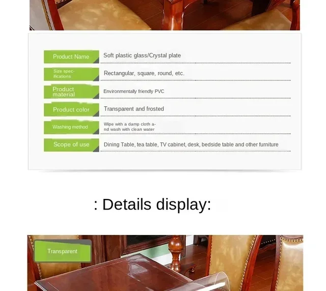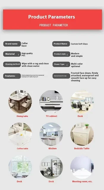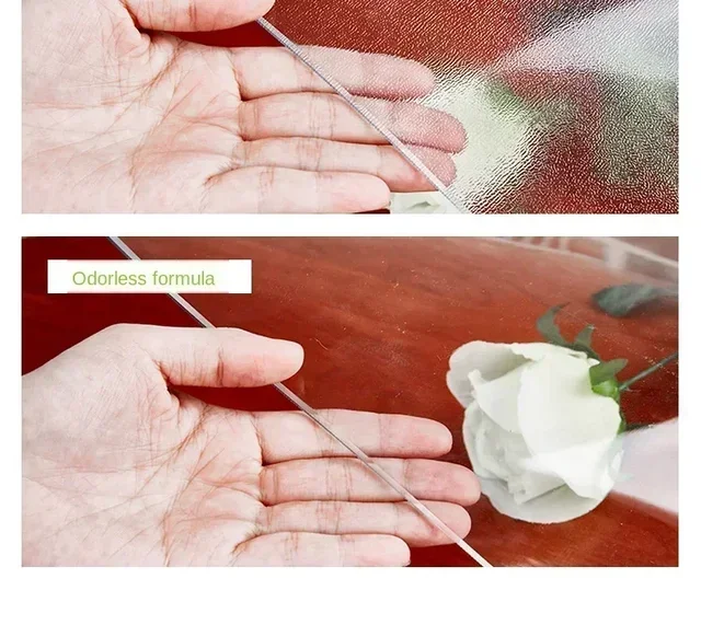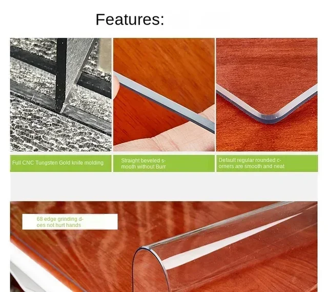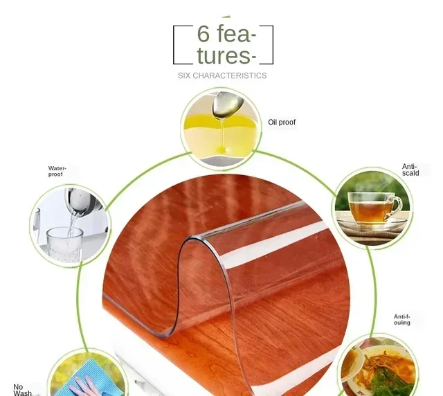 1. Eco-friendly PVC material, easy to clean, waterproof, oil resistant, stable, tough, very durable, great for dining table, wooden table, glass, marble, stainless steel top, office desk, writing desktops, coffee & end table, tv bench, dresser and chest table, night stand, countertop, hard floor etc. and other furniture top liners to protect your furniture from scratches, abrasions, oil stains, coffee spills, heat burns, etc.